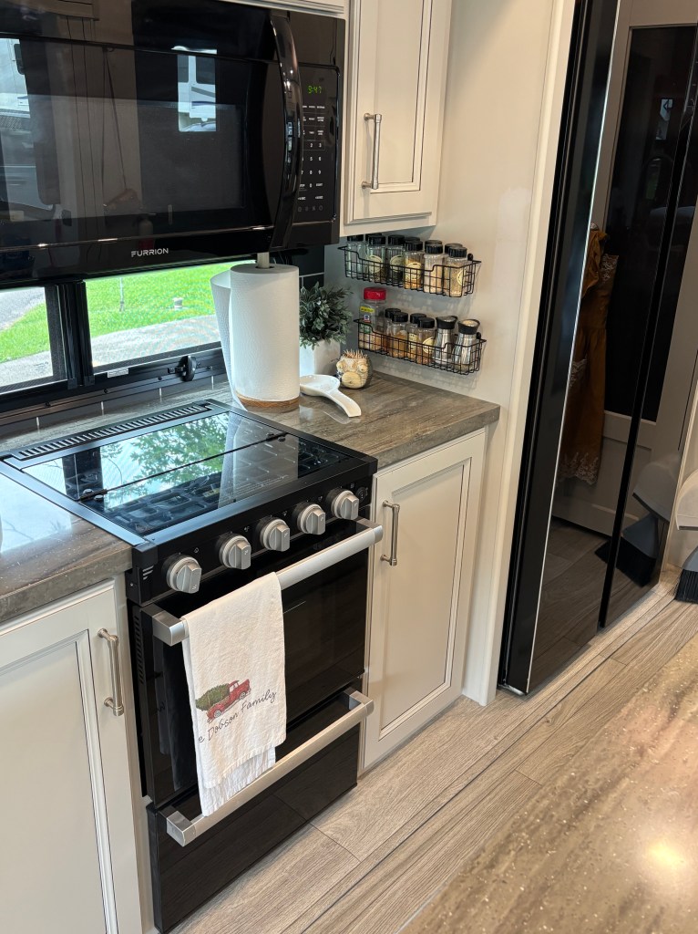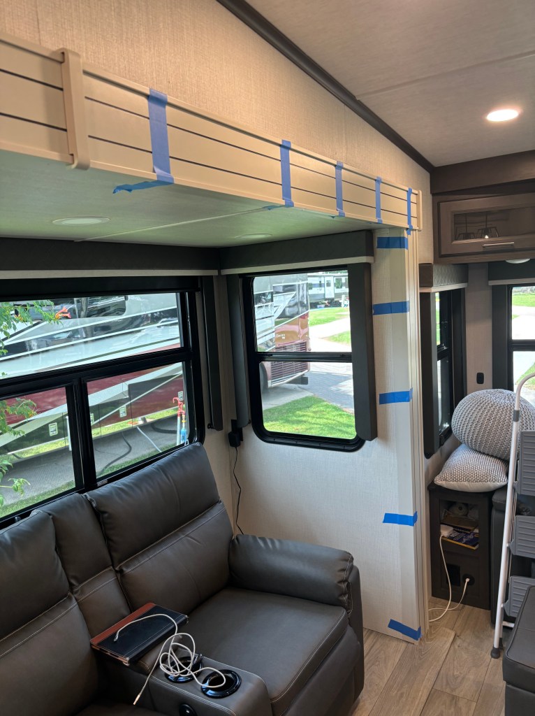 The key items were to get the right adhesive to repair the trim and decorative panel on the fascia of the slide out that came loose. We were able to successfully reattach both pieces and we are getting good at solving problems as this is part of RVing. Theresa also put me to work installing the spice racks next to the stove as she installed hooks and additional retention rods to keep things from moving around when we are traveling. Productive day in completing M&R and PM on the RV.