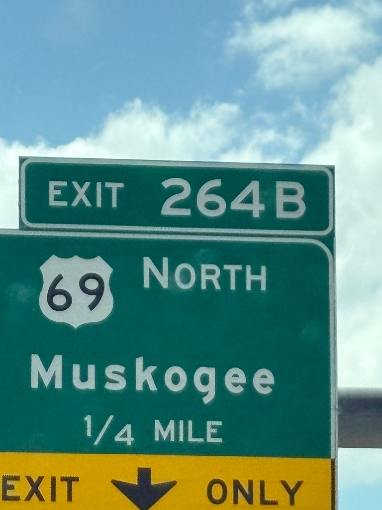 Theresa navigated us to a perfect stop for gas and lunch. Easy to get to the pumps and parking was great for a big rig like ourselves. Uneventful stop half way into our journey and Theresa gets a big Gold Star for picking a great place to stop. The drive was very scenic through Arkansas with mountains, hills and lots of water. As we entered Oklahoma the scenery began to look very familiar and Theresa captured some photos of city signs that we would love to see who can identify the celebrity associated with the city.