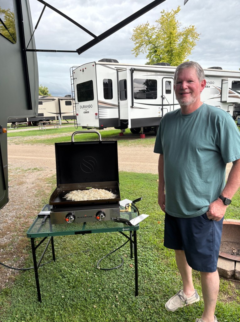 We had an amazing weekend with Josh, Jess, Austin, Dobson, Evelyn and Mick. We visited with everyone at Jess and Austin’s house where we enjoyed some amazing KC BBQ. One of our favorite places is Johnny’s BBQ with their specialty being ribs! We learned that an employee bought it. It was renamed to J’s BBQ. The name changed but the BBQ was still as good as I remembered. It was great to see everyone and spend time catching up. Theresa even played hide and seek with Evelyn and Mick. We called it an early night and made a stop at Walmart for supplies. We are hosting brunch at the RV on Sunday. The Grand Kids are excited to see Grandpa and Grandma’s RV!