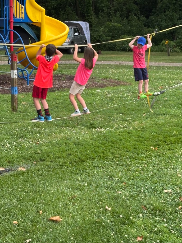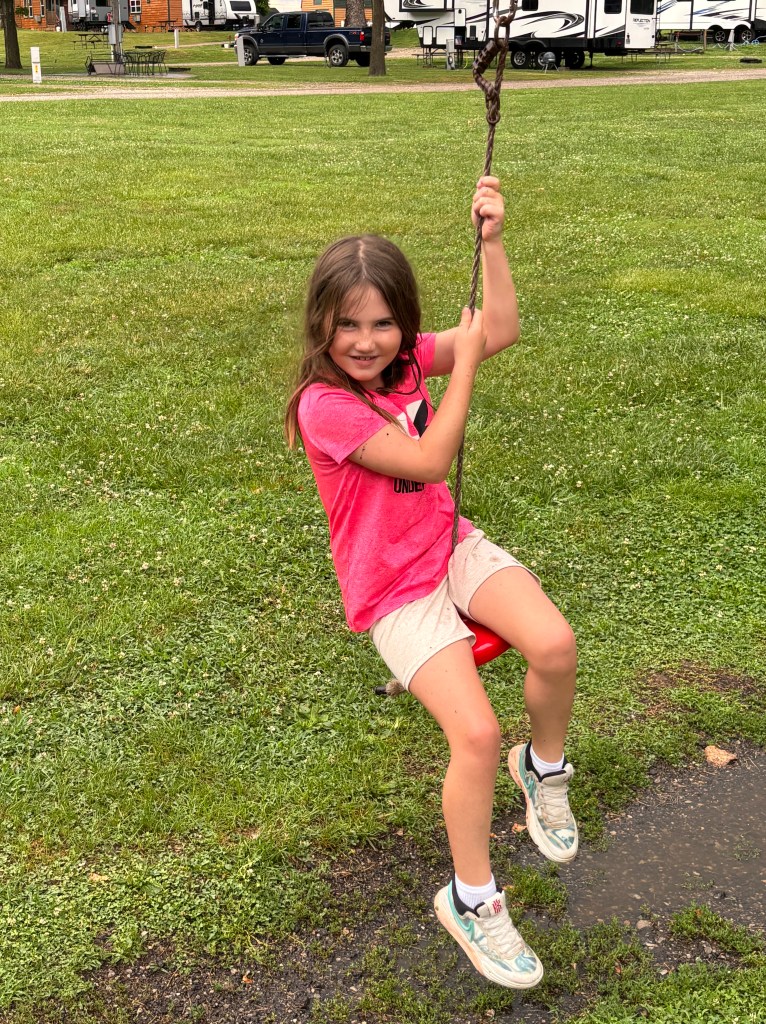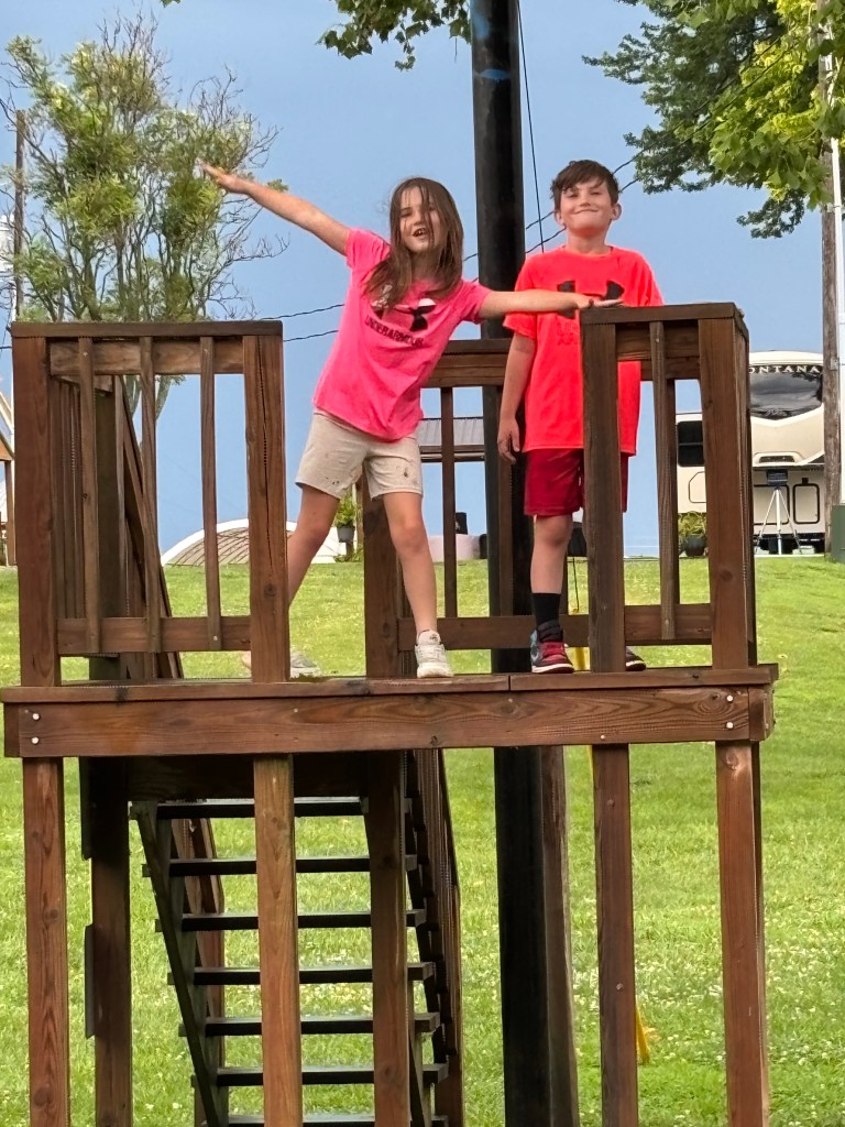 We finished breakfast just in time for the sky to open up with a down pour. Luckily we were under the canopy and rushed to get everything inside the RV. We can’t get away from the rain! The grand kids had some time in the RV to explore. They learned how to change the color of the fireplace flames. One cute moment, Evelyn was at the pantry door asking grandma if that was the door to the kitchen. We wrapped up the time with Jess, Austin and the grand kids enjoying the mini zip line at the RV park. Sharing photos below for everyone to enjoy.
