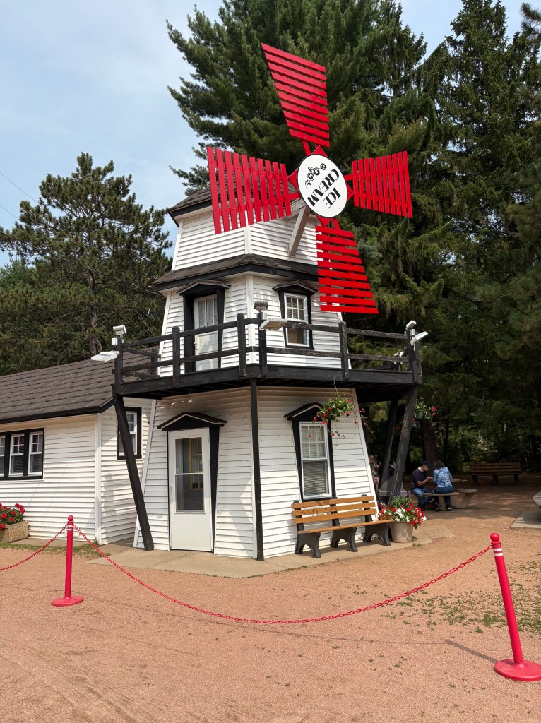 We spent day 58 exploring downtown Tomahawk. We had to go to the local cheese place to stock up on delicious Wisconsin cheese. Always a priority when visiting Wisconsin is stocking up on cheese, yum! We checked out the local Mexican restaurant and it was very good as well. We wrapped up our afternoon heading to our favorite place the Windmill to enjoy their amazing ice cream. The views of the lake are great. They have a dock for boats to stop for ice cream as well. We have great memories of spending time with family here on vacation. It was wonderful to take time to remember those moments. We wrapped up the day with dinner at the RV and watching a movie. Great stop in Tomahawk, Wisconsin.
