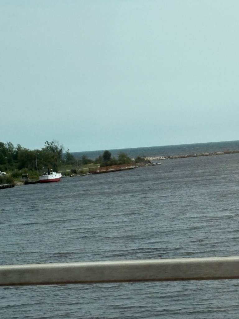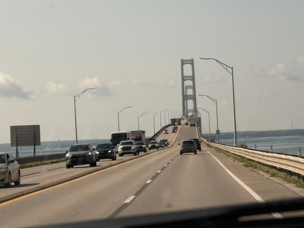 Day 61 started with saying goodbye to Curtis, Michigan. We were excited about the drive today through the UP and across the Mackinaw bridge over the Great Lakes. We started the trip with a GPS issue due to poor cell signal. From our trip to Wisconsin, I learned not to move until we fixed it. So I got out of the truck and began to walk towards the RV park office. I didn’t have to go far before the GPS map finally loaded. We were all set and I was all ears when listening to the master navigator. We were not disappointed as the views were incredible along Highway 2 through the UP of Lake Michigan. The ride across the Mackinaw Bridge was incredible with amazing views. We would have loved to visit Mackinaw Island but not in the cards for this trip. The rest of the trip was on I-75 to the Ann Arbor KOA. The view reminded us a lot of the drives in the Northeast and soon the traffic was the same. We had not experienced city traffic for sometime and we definitely did not miss it. We arrived in Ann Arbor during rush hour and we set-up as if we had done this a few times. We are definitely pros at setting up now! We have been craving pizza so we got pizza from a local place Mister Pizza. It was amazing or we were just famished. I think it was both! We have a view of the lake from the back of our RV. We enjoyed another quiet evening in Ann Arbor, Michigan. We look forward to exploring the area today!