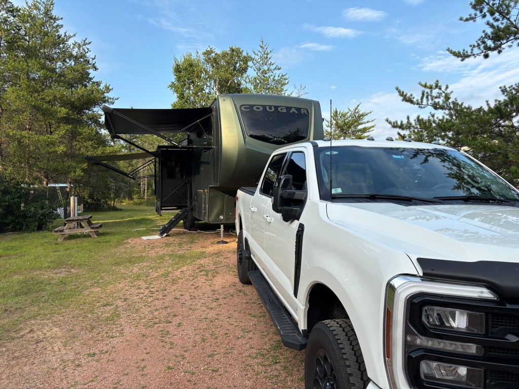 Day 59 was breakdown and travel day to Curtis, Michigan in the Upper Peninsula. We are excited to visit the UP as we have heard great things about the area. The journey there was beautiful as we spent most of the trip on state highways with very little traffic. We quickly learned that there is no such thing as good cell service in the UP. It also meant that streaming on the TV was going to be a challenge, not good. We arrived early afternoon and back on Eastern Time at the RV park. We had a great treed lot with no-one close by us. We setup the site with planning Day 60 for breakfast on the Blackstone and grilling steaks on the grill. Nothing better than starting the day with a hotcake breakfast on the Blackstone. We ended the day with a gully washer of a storm that gave the RV a great wash.